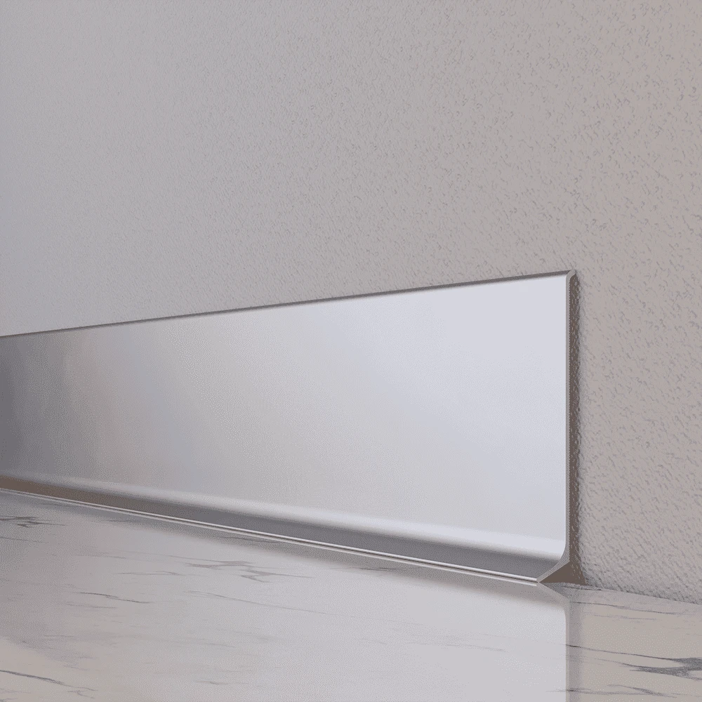 Наш мінімалістичний алюмінієвий плінтус поєднує елегантність із високою міцністю. Він стійкий до впливу вологи, подряпин і сонячного світла, тож чудово підходить для приміщень з високою прохідністю та вологістю — ванних кімнат, коридорів, кухонь тощо.