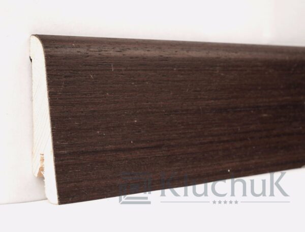 Плінтус має сучасний дизайн з гладкими лініями і злегка звуженої формою, що додає елегантності та стилю будь-якому приміщенню. Колір венге – темний, дозволяє йому добре підійти до будь-якої кольорової гами.